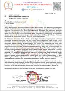 Surat bernomor 059/DPP-SPRI/III/2021 tanggal 17 Maret 2021 ini, ditanda tangani Ketua Umum DPP SPRI,Hentje G Mandagie dan Sekretaris Umum, Edi Anwar Asfar. Dengan prihal surat, “Pelanggaran Administrasi Pemerintahan Menggunakan Peraturan Dewan Pers (DP)”.